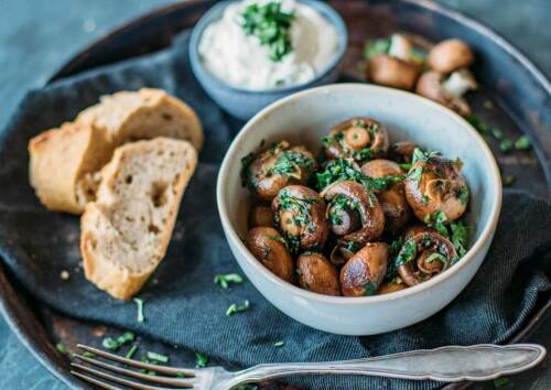 Dieses Gericht gehört mit Sicherheit in die Kategorie 'schnellste Zubereitung'! In nur 10 Minuten steht eine deftige Brotzeit auf dem Tisch. Würziger Hummus und milde Champignons ergänzen sich hier prima, dazu ein Brot deiner Wahl – ich empfehle ein schönes Bauernbrot. Rote Zwiebel und Rosmarin verfeinern deine gebratenen Pilze zusätzlich.