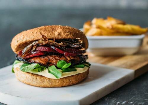 Unser Portobello-Burger kommt gefüllt mit feinen Rote Bete, Feldsalat, Schalotten und einer Mandel-Mayo daher. Doch der Star ist natürlich der marinierte Portobello-Pilz, der als Patty dient und einen natürlichen Fleischersatz darstellt. Das solltest du unbedingt mal ausprobieren.