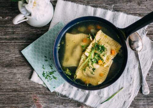 Vegane Pilzmaultaschen in Gemüsebrühe