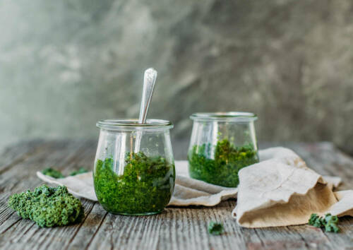 Als Quelle für Vitamin B2 empfehle ich dir Vollkornprodukte, Milch, Brokkoli und Grünkohl. Da Riboflavin zwar nicht hitzeempfindlich, aber lichtempfindlich ist, achte auf eine dunkle Lagerung. Verwende die Garflüssigkeit von Gemüse nach Möglichkeit mit. Als passendes Rezept triffst du mit diesem veganen Kartoffel-Smash mit Brokkoli-Aioli oder mit unserem Grünkohl-Pesto voll ins Schwarze. Das leuchtend grüne Pesto eignet sich perfekt zu Vollkornpasta und hat dank Knoblauch, Mandeln und Olivenöl noch mehr für deine Zellen zu bieten.