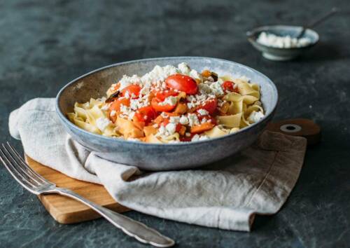 Probier doch mal diese pikanten Nudeln mit Tomaten und Feta, die zusätzlich zellschützendes Allicin aus Knoblauch sowie weitere Antioxidantien aus Möhre, Zwiebeln, Tomate und Olivenöl enthalten.