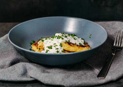 Mittagessen: Kartoffel-Rösti mit Schnittlauch-Dip und unserem würzigen Gurken-Salat mit Dill und roter Zwiebel für eine Extraportion Genuss und Nährstoffe.