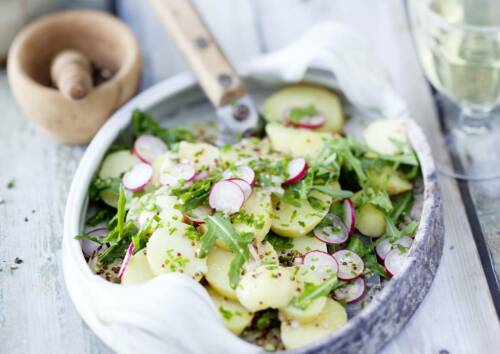 Abendessen: Kartoffel-Salat mit Radieschen mit Dijon-Senf, Rucola und Schnittlauch. Du kannst direkt 4 Portionen – 2 Portionen für morgen Mittag – zubereiten. Als Dessert gibt es einen eisenreichen Heidelbeer-Spinat-Smoothie, den du mit 1 TL Lein- oder Walnussöl für ausreichend Omega-3-Fettsäuren verfeinern kannst.