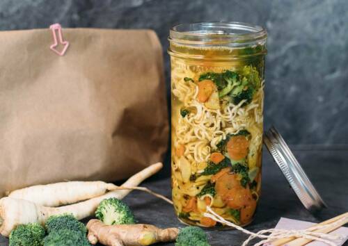 Mittagessen: Frische Mie-Suppe to go mit Brokkoli, Möhre und Wurzelpetersilie, die du auch durch etwas Sellerie ersetzen kannst. Einfach vor dem Servieren mit kochendem Wasser aufgießen und heiß genießen. Als Dessert gibt es 1 Apfel und 3 Walnusskernhälften.