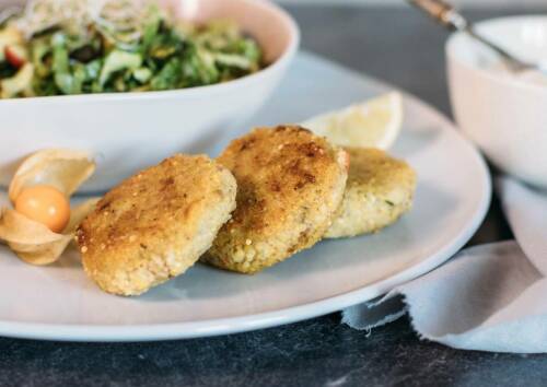Mittagessen: Hirse-Walnuss-Küchlein mit erfrischendem Gurken-Dip die Zweite. Die nährstoffreichen Taler schmecken auch kalt köstlich. Dazu gibt es Sticks von 1/3 Gurke und 2 Möhren und als Dessert 1 Apfel.