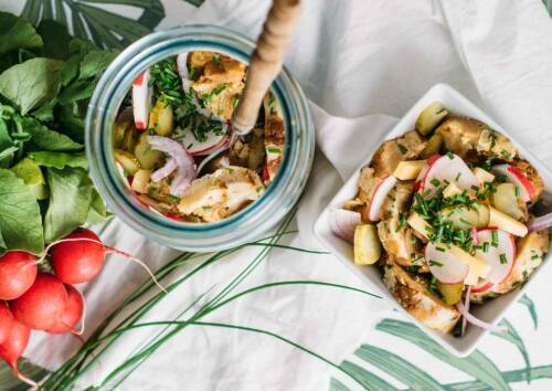 Knödel schmecken nicht nur mit kräfitger Soße, sondern machen sich auch wunderbar im Salat. Dieses schnelle Rezept ist die perfekte Resteverwertung für die Überbleibsel vom Vortag. Essiggurken, Radieschen und Schnittlauch verleihen ihnen eine leichte Frische. Genau das Richtige für wärmere Tage.