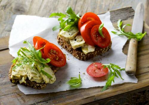Klassichsches Bruschetta ist zwar schon vegan, aber mit Tofu und Rucola schmeckt es auch. Statt Weißbrot wird in diesem Rezept Eiweißbrot getoastet.