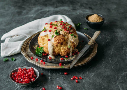 Wir bleiben in der Ferne und reisen nach Indien. Dort werden die Gerichte mit vielen Gewürzen verfeinert. Unser Blumenkohl bekommt ein Tahin-Dressing und darüber kommt Mandel-Dukkah mit Sesam, Koriander, Kümmel und Chili. Das solltest du dir nicht entgehen lassen.