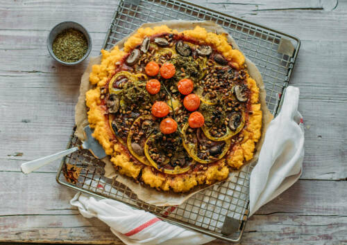Oh bella Italia! Mit knusprigen Pizzen, Pasta aller Art und cremigstem Eis verwöhnst du uns. Holen wir uns doch die Küche Italiens auf unsere Teller mit dieser abwechslungsreichen Polenta-Pizza mit Champignons, Cocktailtomaten und Pesto. Mmh ...