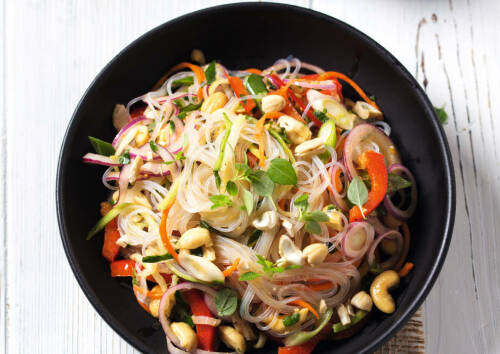 Asiatische Salate wie ein Glasnudelsalat kannst du wiederum mit einer Extraportion eisenreichem Erdnuss-'Crunch' vollenden.