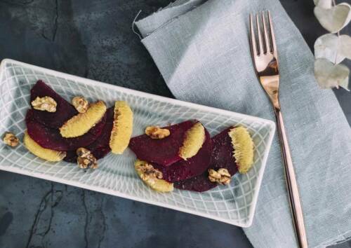 Als eisenreiche Vorspeise kannst du ein pikant gewürztes Rote-Bete-Carpaccio mit hauchdünn geschnittenem Apfel – mariniert in Orangensaft und Walnussöl – mit knackigen Sprossen servieren.