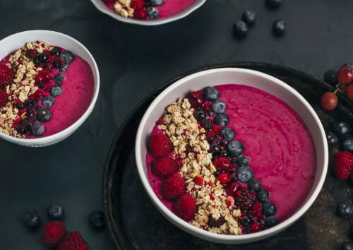 Frühstück: Beeren-Kokos-Smoothie-Bowl für einen fruchtigen Start in den Tag mit zahlreichen Mikronährstoffen.