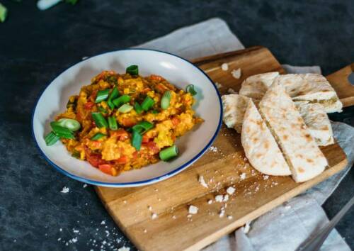 Mittagessen: Shakshuka mit pochiertem Ei mit Protein und Mikronährstoffen aus Tomate und Paprika – mit Kreuzkümmel verfeinert.