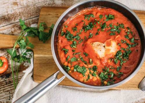 Auch diese orientalische Köstlichkeit darf nicht fehlen: Shakshuka mit pochiertem Ei. Foto: SevenCooks