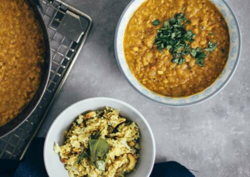 Dal gilt als heimliches Nationalgericht in Indien. Es ist ein köstlicher Eintopf der auf Hülsenfrüchten basiert und mit reichlich Gewürzen wie Kurkuma, Knoblauch, Ingwer und Chili versehen wird. Bei unserem indischen Dal gesellen sich zu den roten Linsen noch Dosentomaten und Kokosmilch, so wird alles schön cremig. Als Beilage noch Reis dazu und fertig ist ein rundum gelungenes Gericht.
