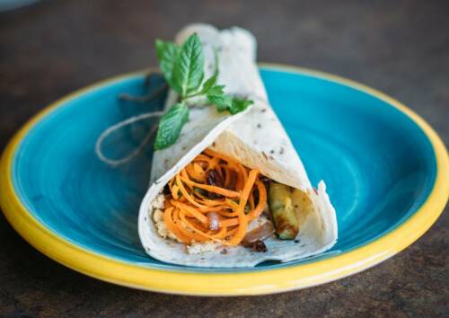 Gefüllt mit Zucchini, Minze, Karotten und Zwiebeln eignet sich der Wrap einwandfrei als sättigender Snack für zwischendurch oder als Abendessen. Dazu passt Hummus super, aber auch Guacamole oder ein Joghurt-Dip ergänzen sich gut mit dem Weizenfladen.
