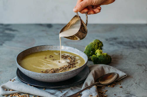 Diese herrlich sättigende Brokkolicremesuppe versorgt dich mit einer geballten Ladung Gemüse, die an kalten Tagen wärmt und garantiert nich langweilig schmeckt. Milde Pastinake und Brokkoli werden püriert und mit etwas Zitrone und Sonnenblumenkernen gepimpt. Hafersahne verleiht dem Ganzen etwas Cremigkeit und so eignet sich die Suppe für Groß und Klein.