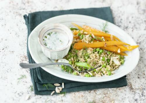 Ein schnelles vegetarisches Gericht mit leckerem Joghurt-Dip, welches durch arabische Gewürze ein orientalisches Aroma mit in deine Küche bringt. Die Kräuter Kreuzkümmel, Minze und Dill verleihen diesem Rezept die nötige Frische und das Couscous macht dich schön satt.