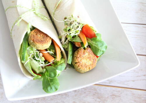 Tortilla-Fladen gefüllt mit Falafel-Bällchen, Avocado, Tomaten, Gurken und allem, was dein Herz begehrt – diese Wraps sind ein richtiges Soulfood. Du kannst sie ganz nach deinem Geschmack füllen und dazu eine fein-würzige Sesamsauce anrühren. Sie eignen sich auch super zum Mitnehmen.