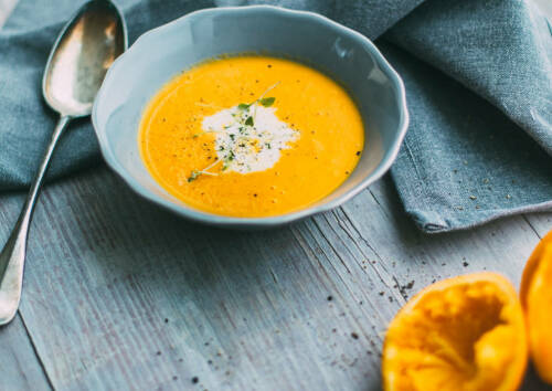 Suppen lassen sich ideal abends vorbereiten und am nächsten Tag mit zur Arbeit nehmen. Diese asiatisch inspirierte Komposition basiert auf sättigender Karotte, feurigem Ingwer, Curry und fruchtiger Orange. Dazu passt eine knusprige Scheibe Vollkornbrot perfekt.