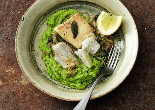 Zum Heilbutt wird hier gesundes Erbsenpüree serviert. Denn dank der kleinen grünen Hülsenfrüchte nehmen wir weniger Kohlenhydrate und mehr Eiweiß auf. Zudem ist der Heilbutt ebenfalls sehr reich an Protein, und enthält dafür so gut wie kein Fett. Aromen von Macadamia, Salbei und Zitrone verleihen dem Gericht nussige aber dafür frische Noten. Probier's mal aus!