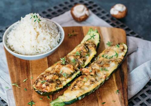 Die Füllung aus Pilzen und Zwiebeln geben mit den Zucchini und dem Käse eine wunderbare Mischung. Dazu gibt es Reis – der macht satt und so eignet sich dieses Gericht für die ganze Familie! Diese gefüllten Zucchini solltest du unbedingt mal probieren.