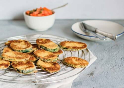 Dieses Rezept eignet sich zum Snacken, für ein Buffet oder in großer Portion auch als Dinner. Dazu werden die Zucchini-Scheiben paniert und mit einem frischen Tomaten-Kapern-Salat ergänzt. Mhhhm ... lecker! Basilikum, Kapern und Olivenöl sorgen für deftige mediterrane Aromen. Dazu kannst du auch einen Kräuterquark servieren.