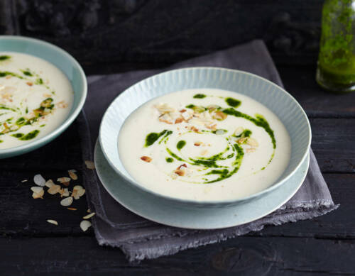 Diese herzhafte Suppe eignet sich hervorragend für die kalte Jahreszeit und enthält außerdem saisonale Zutaten. Kartoffeln, Pastinaken und Zwiebeln bieten die Grundlage der Suppe, verfeinert wird sie mit Mandeln, Crème fraîche und ein bisschen Zitrone. Dazu kannst du ein Vollkorn-Baguette servieren, so werden sicher alle satt.
