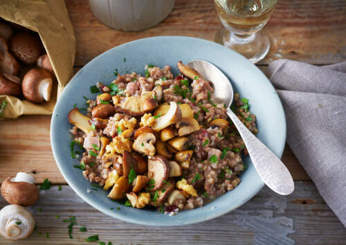 Was auf den ersten Blick wie Reis aussieht, ist in Wirklichkeit Buchweizen. Durch aromatische Pilze, Cranberries, Zwiebeln und etwas Weißwein hast du im Nu das klassische Risotto-Aroma gezaubert. Thymian, Petersilie und Knoblauch verleihen dem Gericht eine frische Kräuter-Note und heben es damit auf ein ganz neues Level.