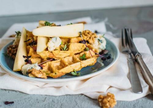 Zum Start in die Woche haben wir etwas ganz Besonderes für dich: Gemüse-Waffeln! Das Gemüse im Teig sorgt nicht nur für eine fluffige Textur, sondern auch für einen frischen Geschmack. Als Topping gibt es cremigen Gorgonzola, süße Birnen, Walnusskerne und Thymian.
