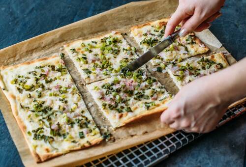 Ein Flammkuchen mit Lauchzwiebeln ist das ultimative Gericht für eine Person. Warum? Du brauchst nur wenig Zutaten, kannst die Portionsgröße genau auf dich abstimmen und ihn auch am nächsten Tag noch aufgewärmt essen. So musst du weder große Mengen einkaufen, noch bleiben viele angefangene Lebensmittel übrig. Den solltest du unbedingt probieren!