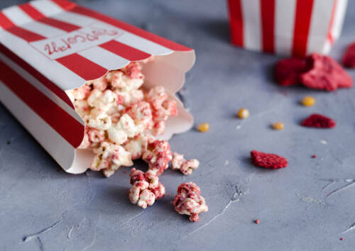 Und weil Popcorn der Klassiker ist, wenn es um Snacks für´s Kino geht, triffst du mit diesen Süßen Popcorn mit gefriergetrockneten, ungesüßten Erdbeerstückchen, Vanille und weißer Schokolade voll ins Schwarze. Am besten nutzt du das Wochenende vor dem Kinobesuch, damit dich die kleinen Hände tatkräftig unterstützen können.