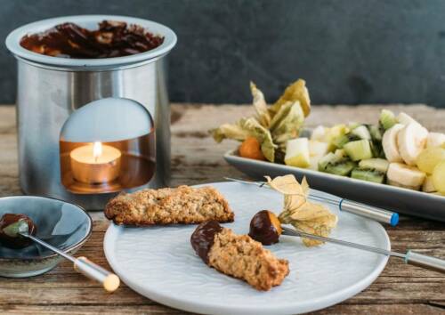 Tipp: Packt euch zwischendurch der Süßhunger, obwohl ihr schon genascht habt, servier doch mal unser Schokofondue aus dunkler Schokolade mit einer Extraportion Obst der Saison. Im Sommer eignen sich zum Eintauchen in die flüssige Schokolade ideal zuckerarme Beeren wie Him- oder Erdbeeren.