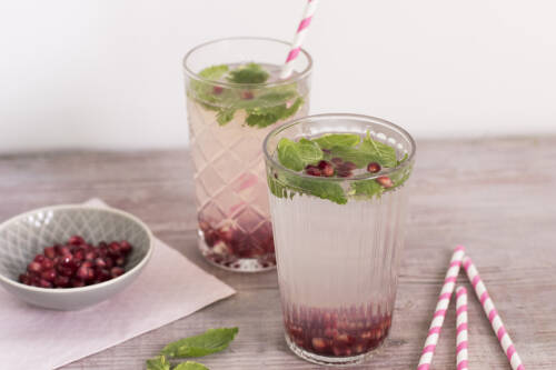 Das Infused Water Granatapfel Minze eignet sich für ältere Kinder. Kleinere Kinder können sich an den Granatapfelkernen verschlucken. Ich würde dir generell empfehlen, natürlich aromatisiertes Wasser für Kinder immer mit Strohhalm – aus Holz oder Edelstahl – zu servieren. Alternativ eignen sich Glasflaschen mit integriertem, transparenten Filter. Denn Kinder lieben die bunten Farben von Kräutern, Gemüse und Obst, die zum Trinken anregen.