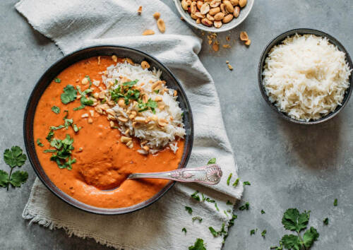 Mittagessen: Erdnusssuppe mit Reis und asiatischen Nuancen sowie reichlich Antioxidantien dank Koriander, roter Zwiebel, Chili und Ingwer.