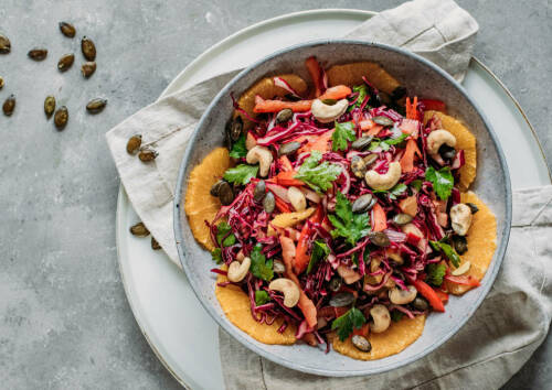 Mittagessen: Rotkohlsalat mit fruchtiger Orange, Cashewkernen, Apfel und Kürbiskernen sorgen für einen vitaminreichen Wochenausklang. Du kannst 2 Portionen servieren.