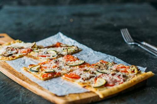 Geht es um schnelle Küche, dann darf der französische Klassiker nicht fehlen. Bis vor ein paar Jahren war der Flammkuchen in meinem Essensplan nicht zu finden, doch heute ist er die perfekte Grundlage für die Reste aus dem Kühlschrank. Mit unserer fix zubereiteten Variante gibt es eine Extraportion Vitamine durch Tomaten, Pilze und Zucchini.