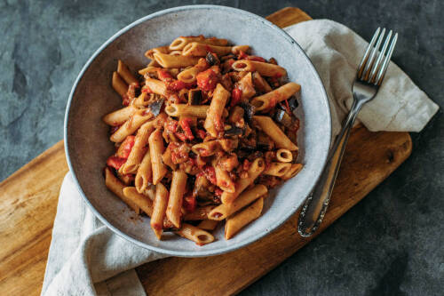 Ich weiß genau, was du gerade wahrscheinlich denkst. Und nein, die Pasta hat nichts mit dem Discounter zu tun. Penne alla Norma ist eine typische sizilianische Spezialität, bei der der Sugo aus Auberginen, Tomaten und frischem Basilikum besteht.