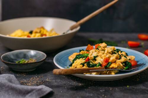 Rührei hört sich eher nach Frühstück als nach richtiger Mahlzeit an? Von wegen! Mit nur wenigen Handgriffen pimpst du dein Rührei auf und der Spinat und die Tomaten sorgen in dem Gericht für die nötigen Nährstoffe, die du brauchst um aufnahmefähig zu sein.