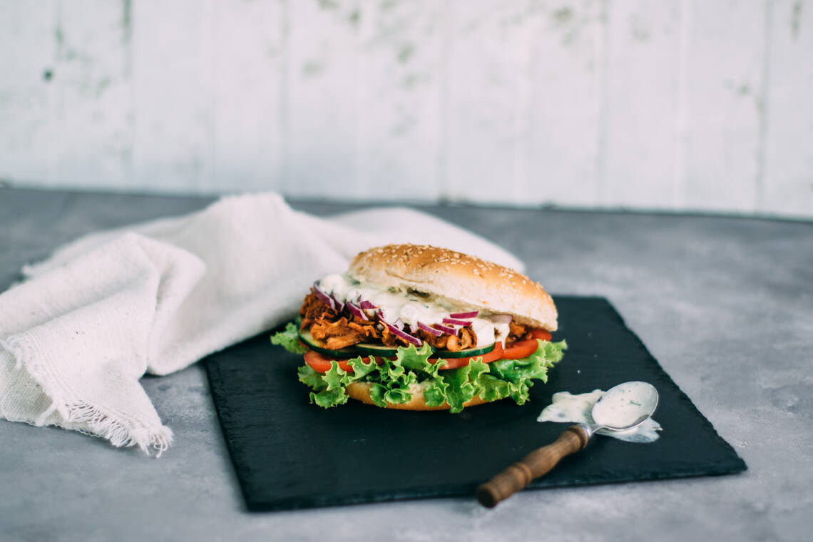 Ist das da Fleisch auf dem Burger? Nein, aber sieht genauso aus. Und schmeckt mit den entsprechenden Gewürzen auch so. Jackfruit heißt der neue Stern am kulinarischen Himmel von Veganern und Vegetariern. Eine Frucht, die es schafft, die Konsistenz von Fleisch täuschend echt nachzuahmen. Entsprechend findet sie Verwendung in der veganen oder vegetarischen Variante vieler klassischer Fleischprodukte, wie etwa in unserem Pulled-Pork-Burger.