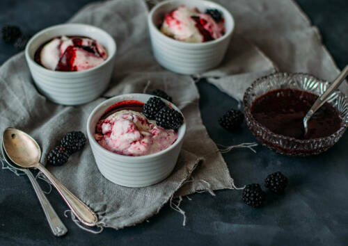 Zucker: Ob ich Zucker in mein selbstgemachtes Joghurt-Eis gebe, kommt immer darauf an, welchen Joghurt ich verwende. Wenn ich, wie meistens, zu griechischem Joghurt greife – oft auch einem, der schon Honig enthält – verwende ich keinen Zucker. Solltest du dennoch Zucker hinzugeben wollen, dann empfehle ich dir 100g Puderzucker pro 500g Joghurt.