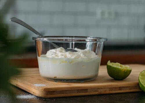 Halbiere die Limette und gib den Saft einer halben Limette zum Joghurt und Salz.