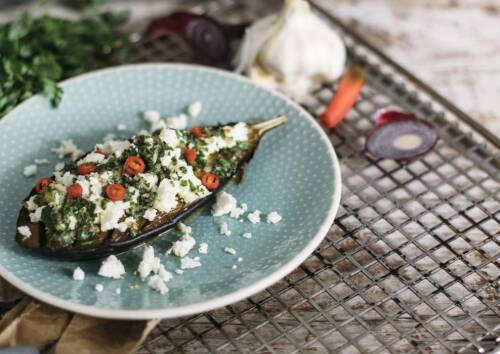 Eines meiner kulinarischen Highlights ist Chimichurri. Die argentinische Soße ist mit ihren verschiedenen Kräutern, dem Knoblauch und Chilis eine wahre Geschmacksexplosion. Während sie die Argentinier hauptsächlich zu Fleisch servieren, esse ich die Soße am Liebsten zu Auberginen. Wenn die eingeschnittene Aubergine im Ofen weich wird, kann sich das Fruchtfleisch anschließend wunderbar mit dem Chimichurri vollsaugen. Feta drüber bröseln und schon ist das Gericht fertig.