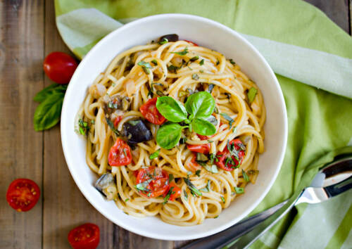 Wer Lust aufs Kochen hat, nicht aber auf den großen Abwasch, der dürfte ein großer Fan von One-Pot-Rezepten sein. Wie der Name schon sagt, wird alles in einen Topf geworfen und schwupps, steht ein leckeres Gericht auf dem Tisch. Die Aubergine harmoniert in dem Gericht super mit den Tomaten und dem Olivenöl. Damit die Nudeln und die Soße nicht zu mehlig schmecken, würde ich dir empfehlen, frische Eiernudeln zu verwenden, die du auch erst kurz vor Ende in die Soße gibst – jedoch ist das Gericht dann nicht mehr vegan. Übrigens, es ist einfacher Nudeln selbst zu machen, als du denkst. Probiere es doch mal aus.