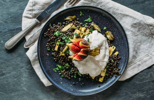 Feige an cremiger Burrata und Linsenbett