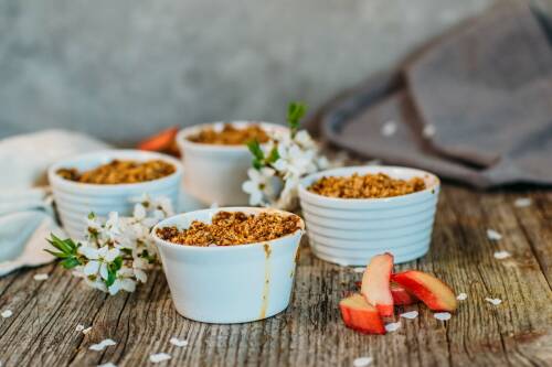 In unserem Rezept für Rhabarber-Crumble trifft süß-saures Kompott auf knusprigen Crumble. Dank Haferflocken und Kokosblütenzucker geht das Rezept als Low Carb durch und ist nur eine kleine Sünde. Dazu passt eine vegane Vanillesauce oder eine Kugel Eis deiner Wahl hervorragend. Ob es den leckeren Rhabarber-Crumble zum Kaffee oder schon als Frühstück gibt, das entscheidest du.