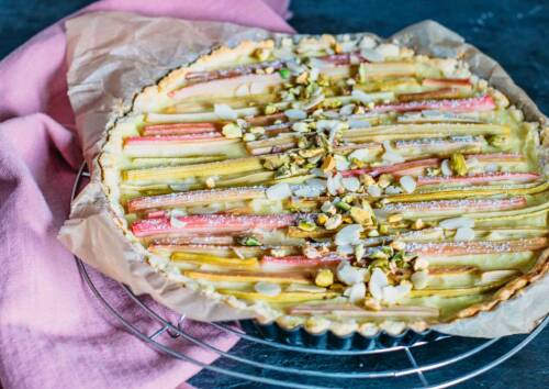 Zum Schluss gibt's noch eine Neu-Interpretation eines klassischen Rezepts. Die Rhabarbertarte ist eigentlich auch nur ein flacher Kuchen mit einem schicken Namen – dank der Säure des Rhabarbers jedoch nicht so süß und schwer. Ein Hingucker ist sie aber schon, unsere Tarte, dazu eine Kugel Vanille-Eis und das Dessert ist geritzt. Auf jeden Fall eine tolle Alternative zum herkömmlichen Rührkuchen und vor allem zu empfehlen, wenn Besuch kommt.