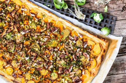 Süßkartoffeln mag ich in jeder Form und Zubereitungsart. Eine abwechslungsreiche Variante stellt dabei unsere Blätterteigteig-Tarte dar, die zusätzlich deftige Aromen von Rosenkohl, Frühlingszwiebeln und Pekannüssen bekommt. Crème fraîche und Senf bilden eine cremige Grundlage und Chiliflocken, Salz und Pfeffer sorgen für die richtige Würze. Mhm ...