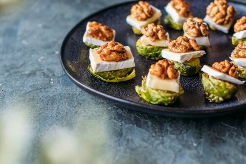 Dieses Fingerfood macht nicht nur optisch sondern auch geschmacklich was her und bringt Abwechslung auf den Tisch. Statt immergleichen Tomate-Mozzarella- oder Traube-Käse-Spießen probiere doch mal Häppchen mit Rosenkohl, Brie und Walnüssen aus. Abgerundet wird das ganze mit wenigen Tropfen Honig, der sich super mit dem herzhaften Käse ergänzt.