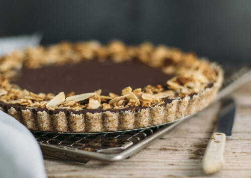 Diese Tarte ist der wahrgewordene Schokotraum für alle Schokoliebhaber. Knapp 500 Gramm Zartbitterschokolade liegen auf einem No Bake Nussboden aus Haselnüssen, Mandeln, Kokosfett und Kokosflocken. Eine Schicht gerösteter Mandelblättchen runden den Schoko-Nuss-Traum ab.